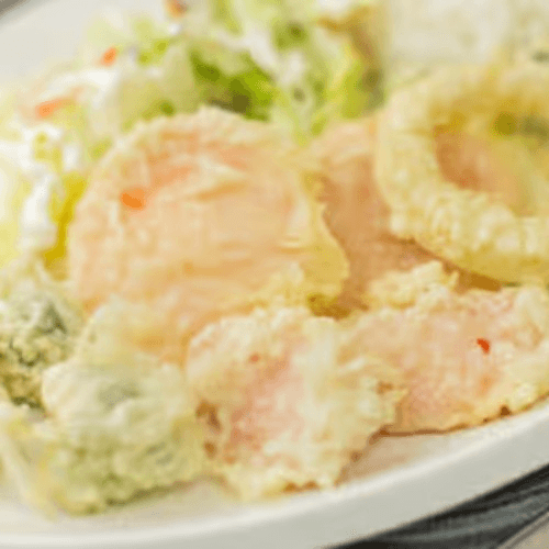 1 piece shrimp tempura and 7 pieces vegetable tempura served with rice and salad. Tempura sauce included.