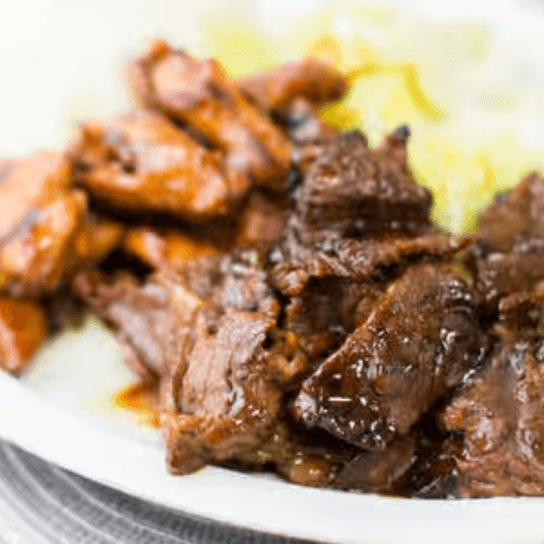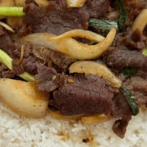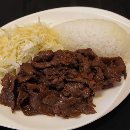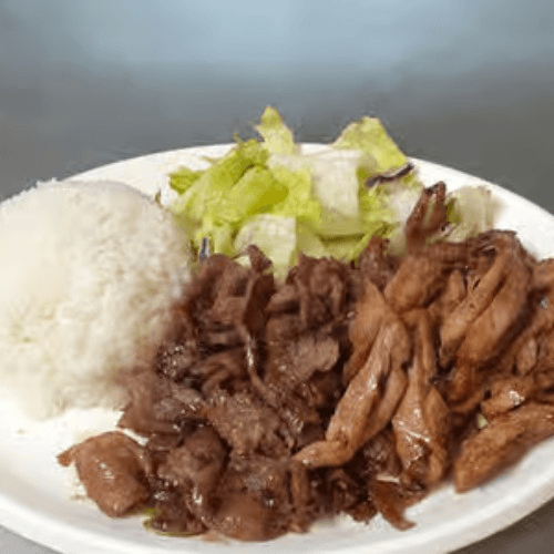 Rib-eye and Chicken Teriyaki served with rice and salad