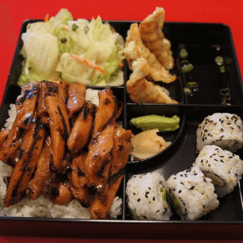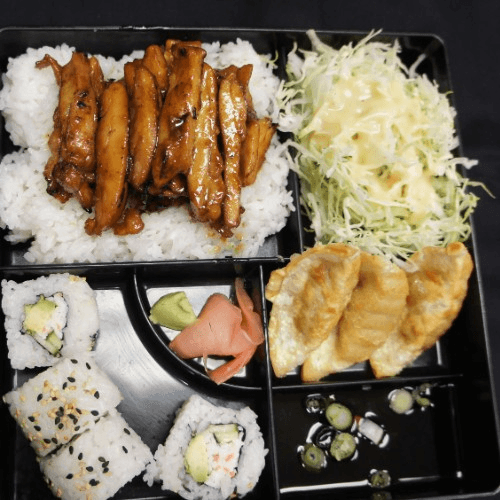 Choice of meat (breast, beef, pork), California roll 4 pieces, gyoza 3 pieces or egg roll 1 piece, 1pc shrimp tempura