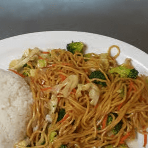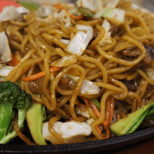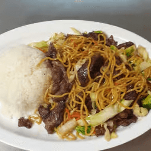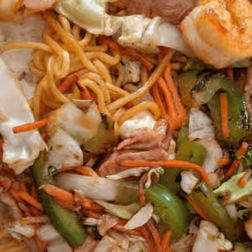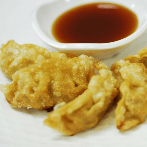 Choice of meat (chicken, beef, pork), California roll 8 pieces, gyoza 10 pieces & egg roll 2 pieces, 1pc shrimp tempura