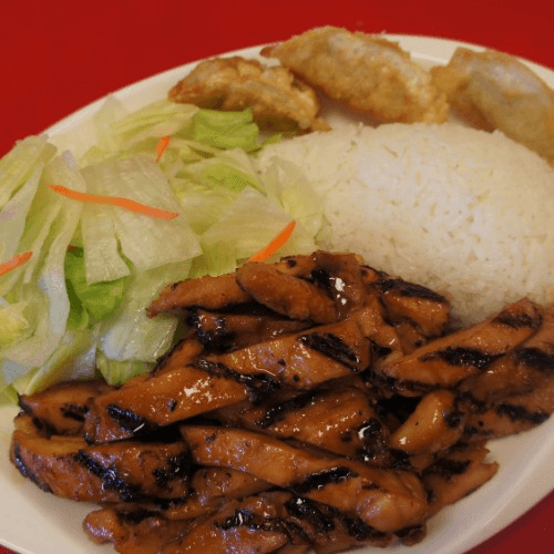 Chicken teriyaki, California roll 4 pieces, gyoza 3 pieces or egg roll 1 piece, 1pc shrimp tempura