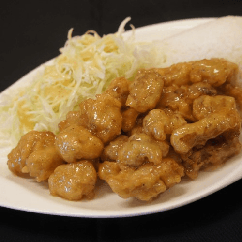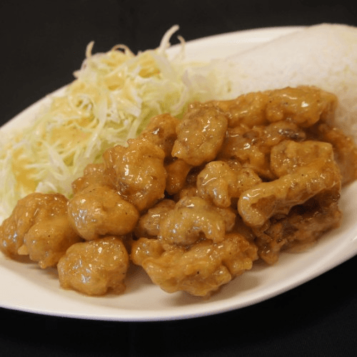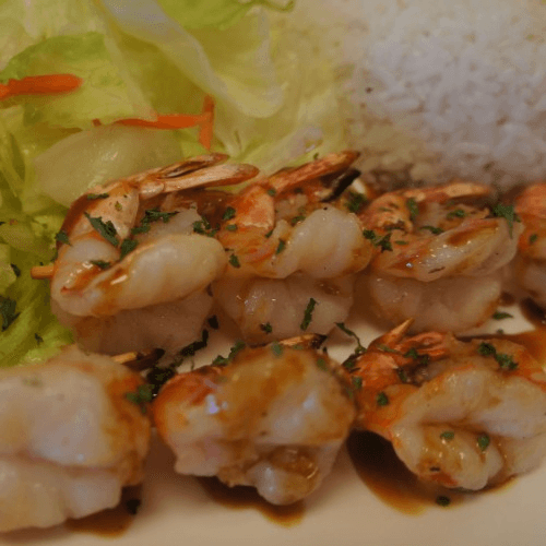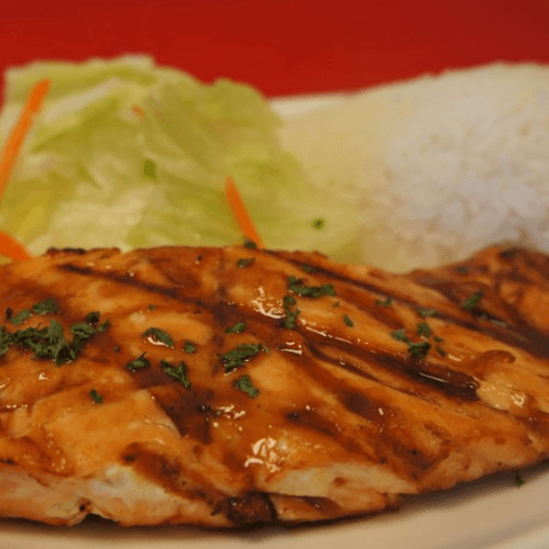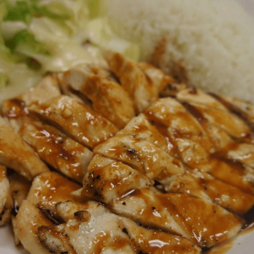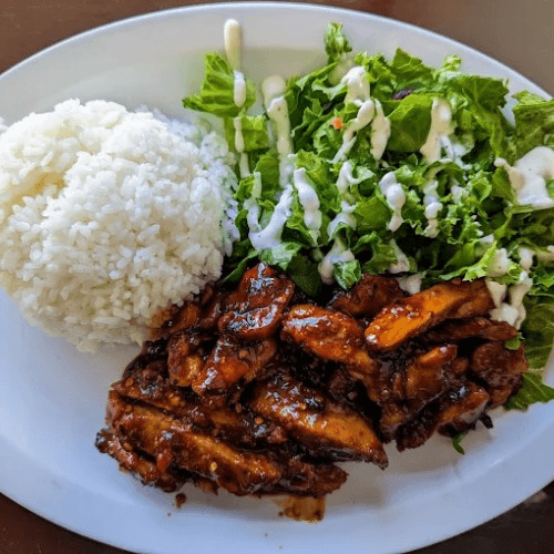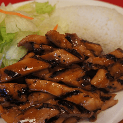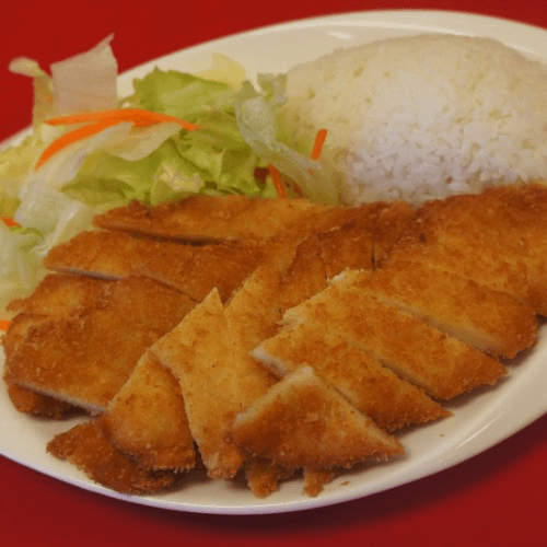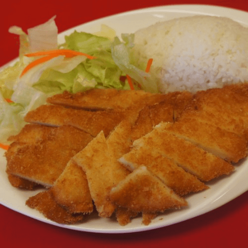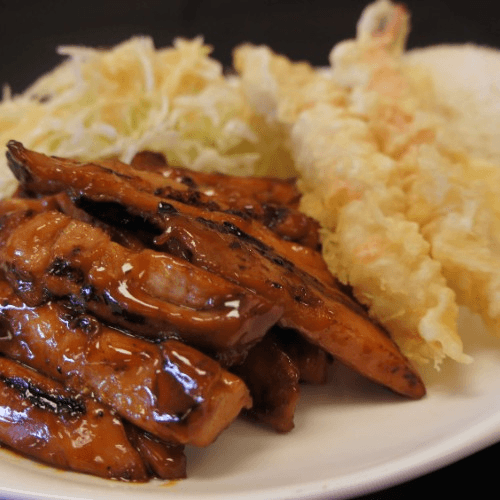 2 pieces Shrimp Tempura served with Chicken Teriyaki, rice and salad.